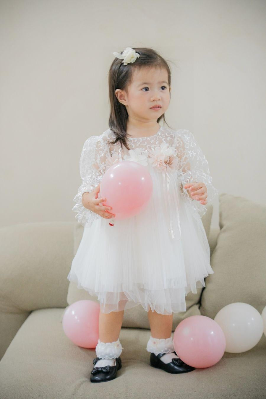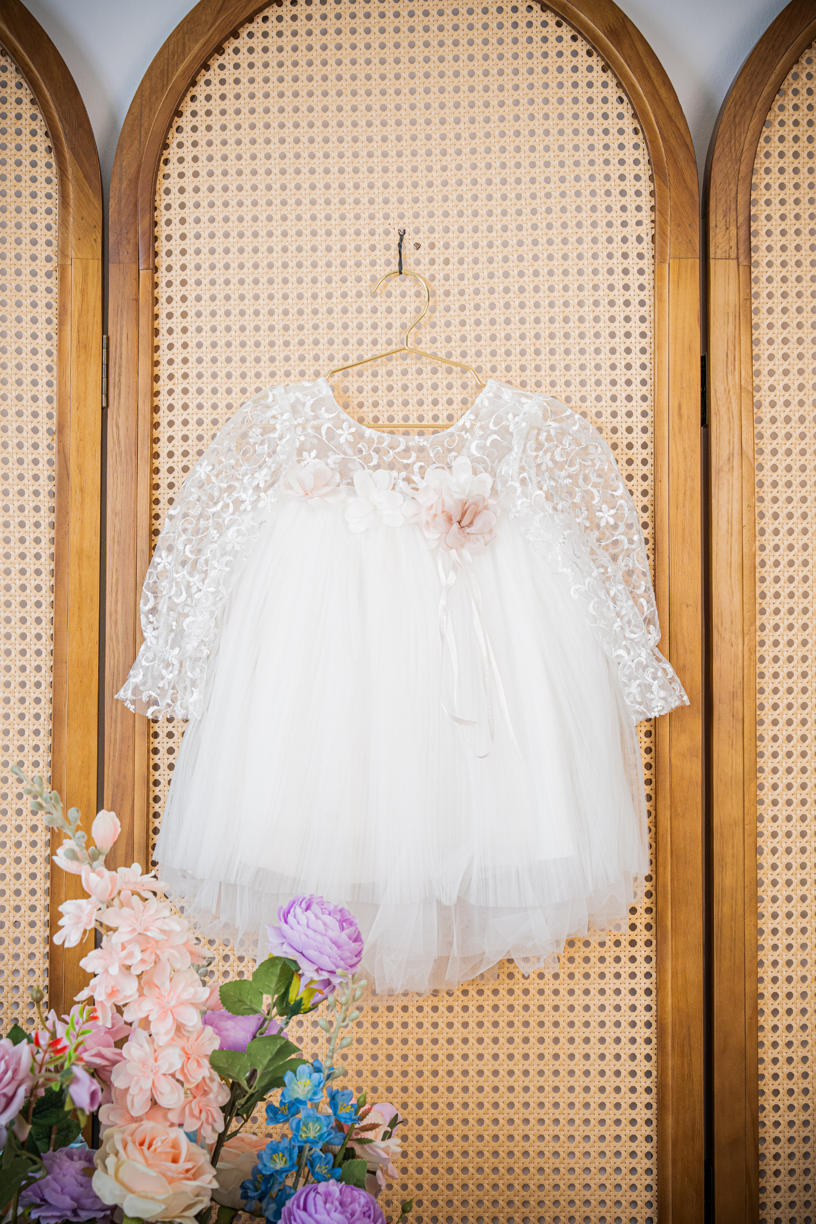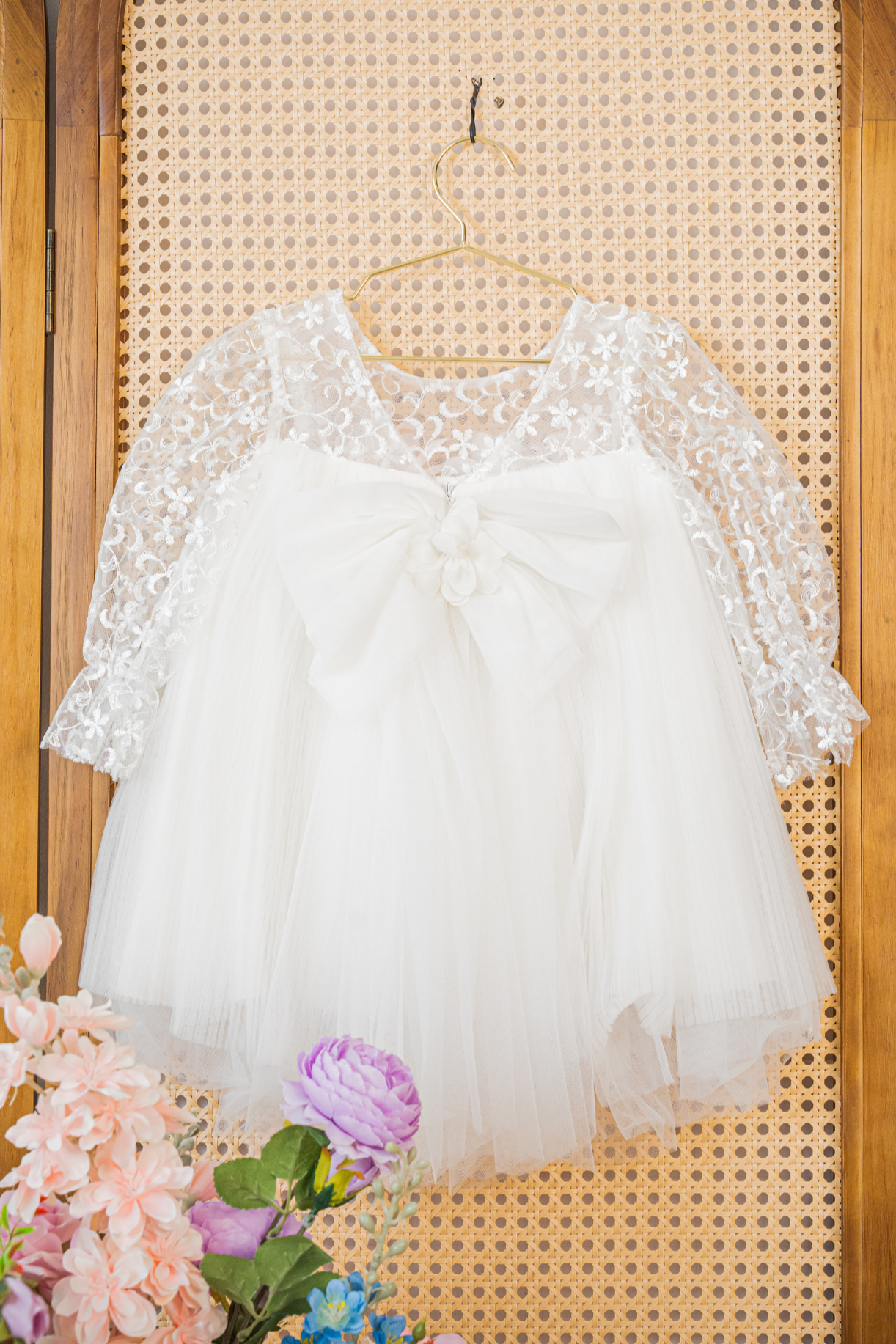 The Alara Bloom Dress features intricate lace sleeves, a flowy layered tulle skirt, and a detachable statement bow. Made for picture-perfect moments, this dress is crafted with lightweight fabrics for all-day comfort and soft pastel floral details for a graceful touch. Your little one will feel like a true princess at weddings, birthdays, and special occasions!