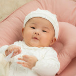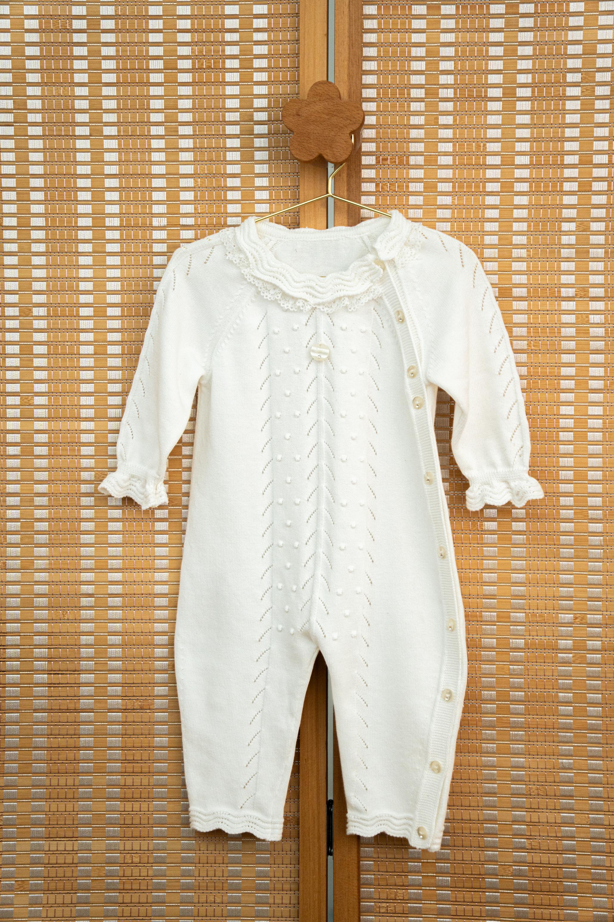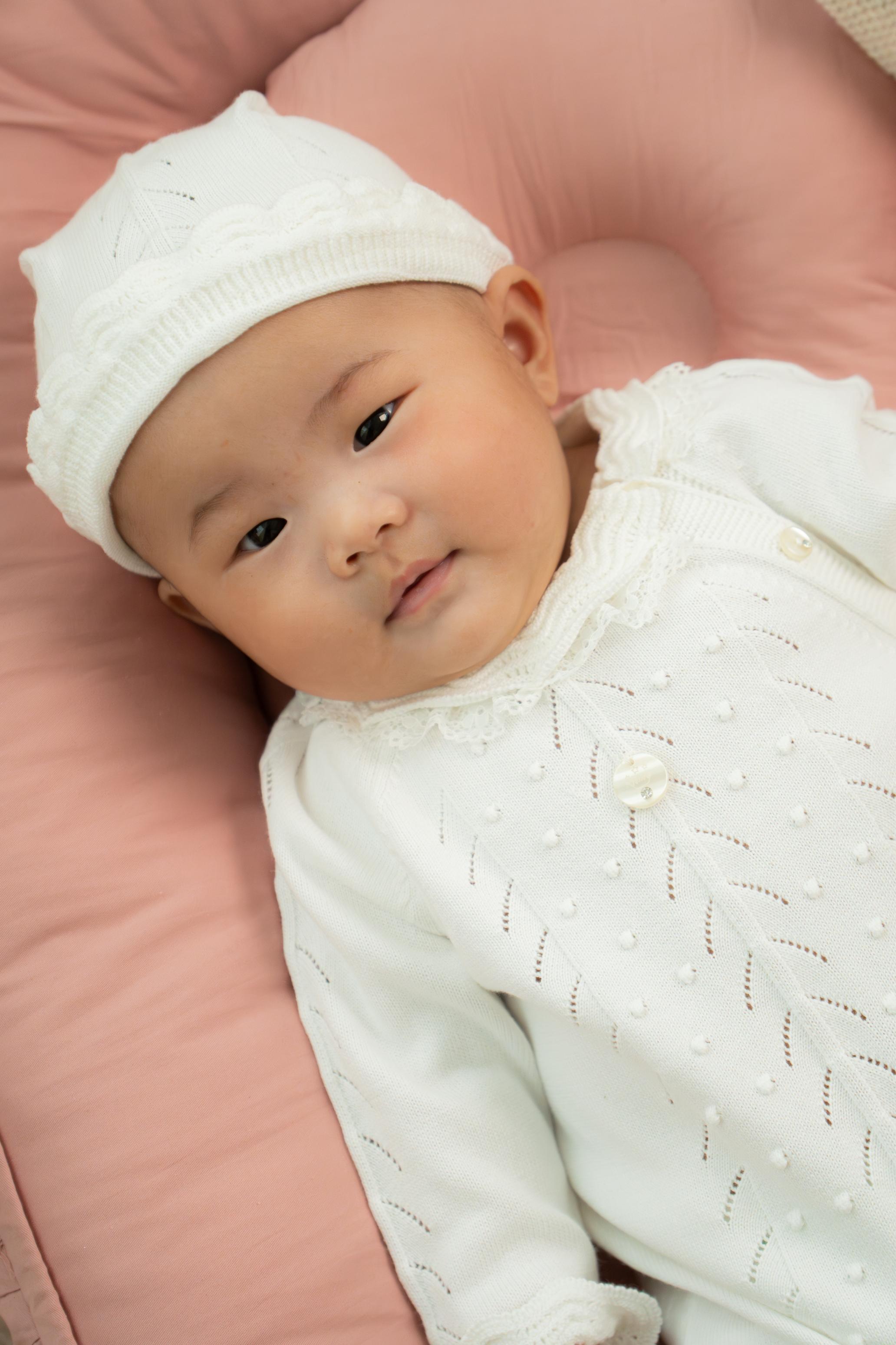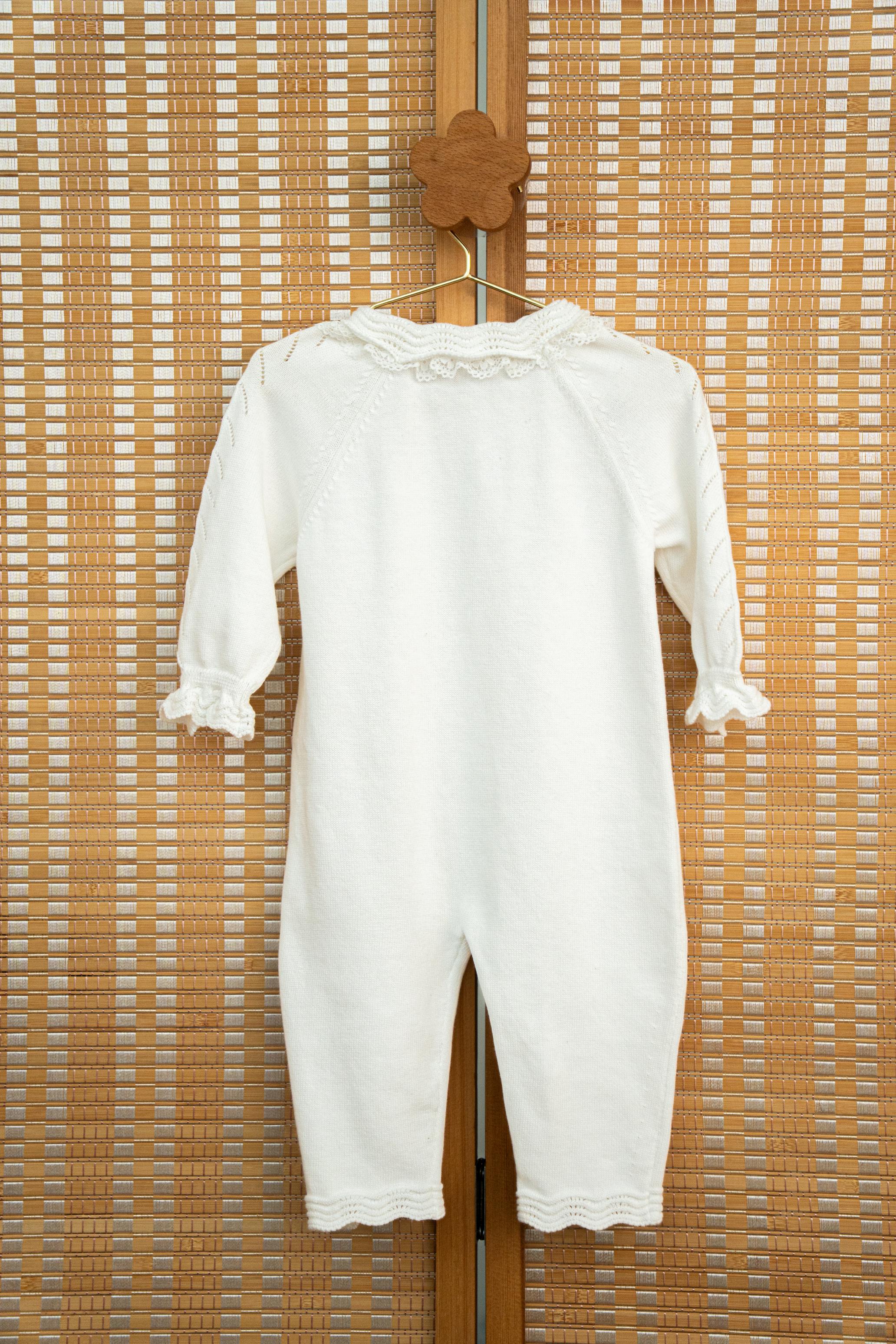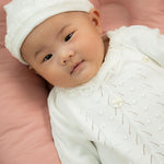 Paired with its matching knitted hat, it creates a beautifully coordinated outfit that feels both timeless and special.