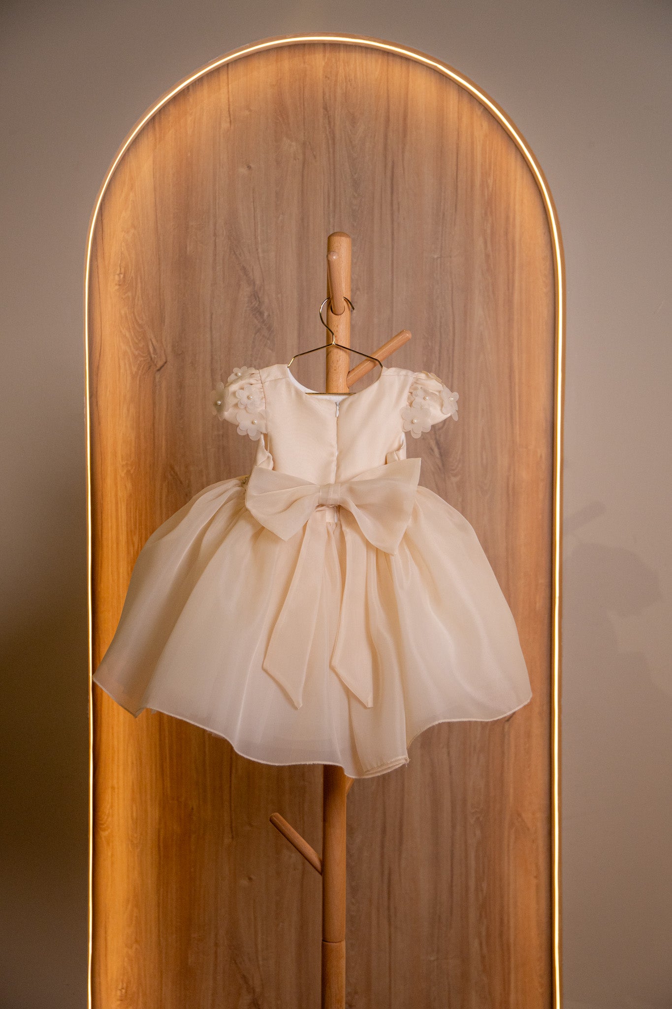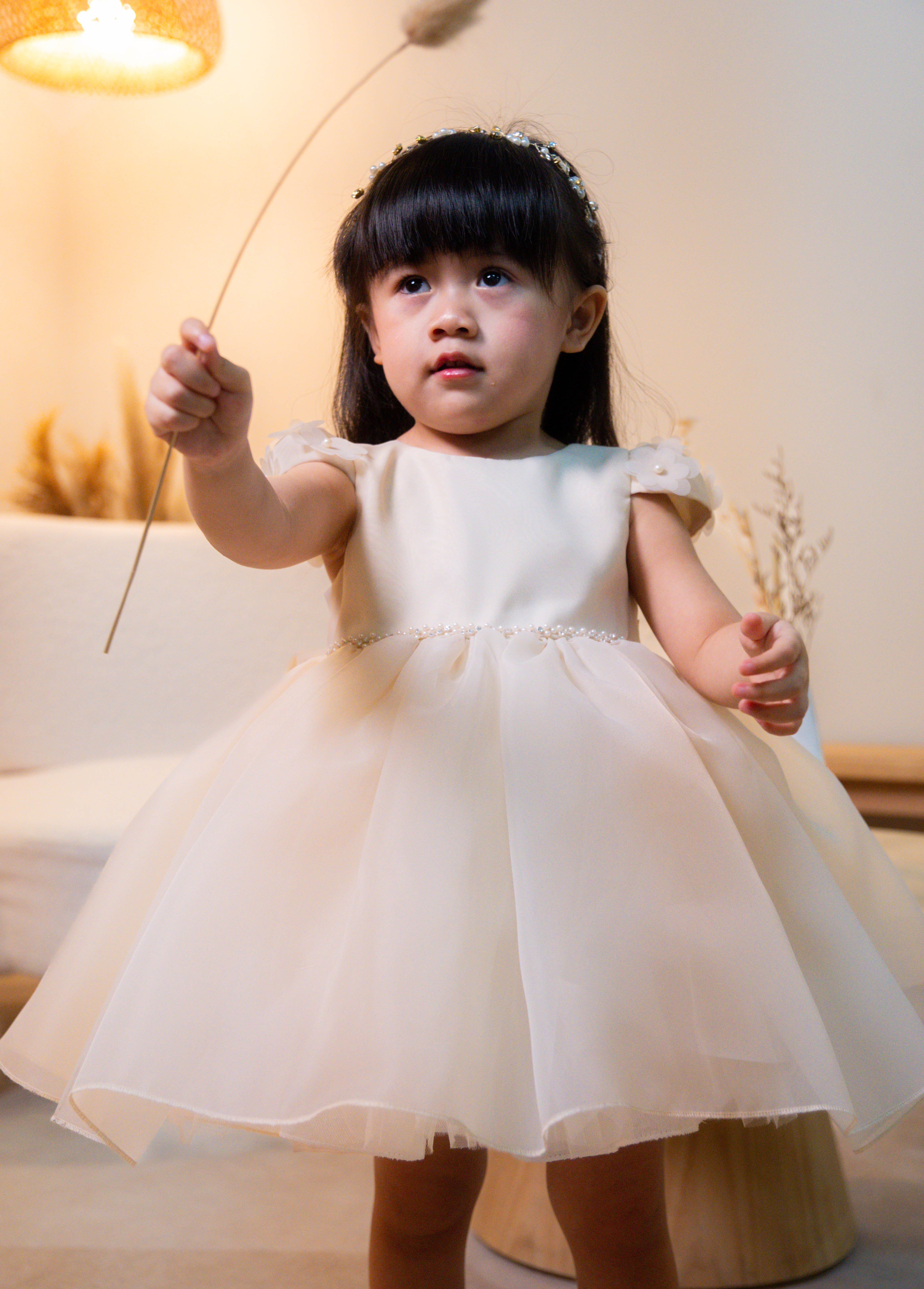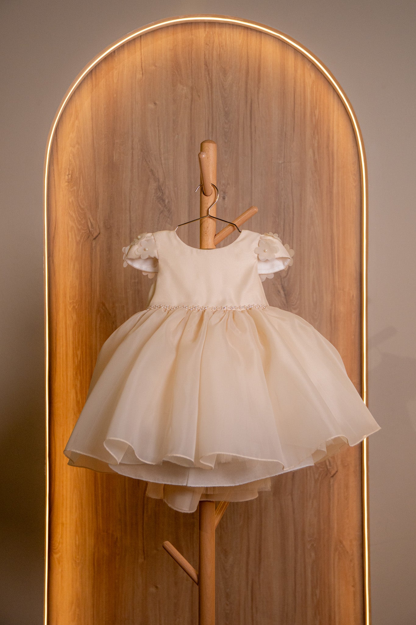 The Melek Bloom Dress captures the sweetness of celebration in a soft champagne hue. Designed with delicate 3D floral sleeves, a pearl-accented waistband, and layered tulle that flows effortlessly, it’s a timeless piece made for birthdays, weddings, and treasured moments. Comfortably lined and exquisitely detailed, this dress is perfect for little angels who love to twirl.