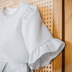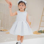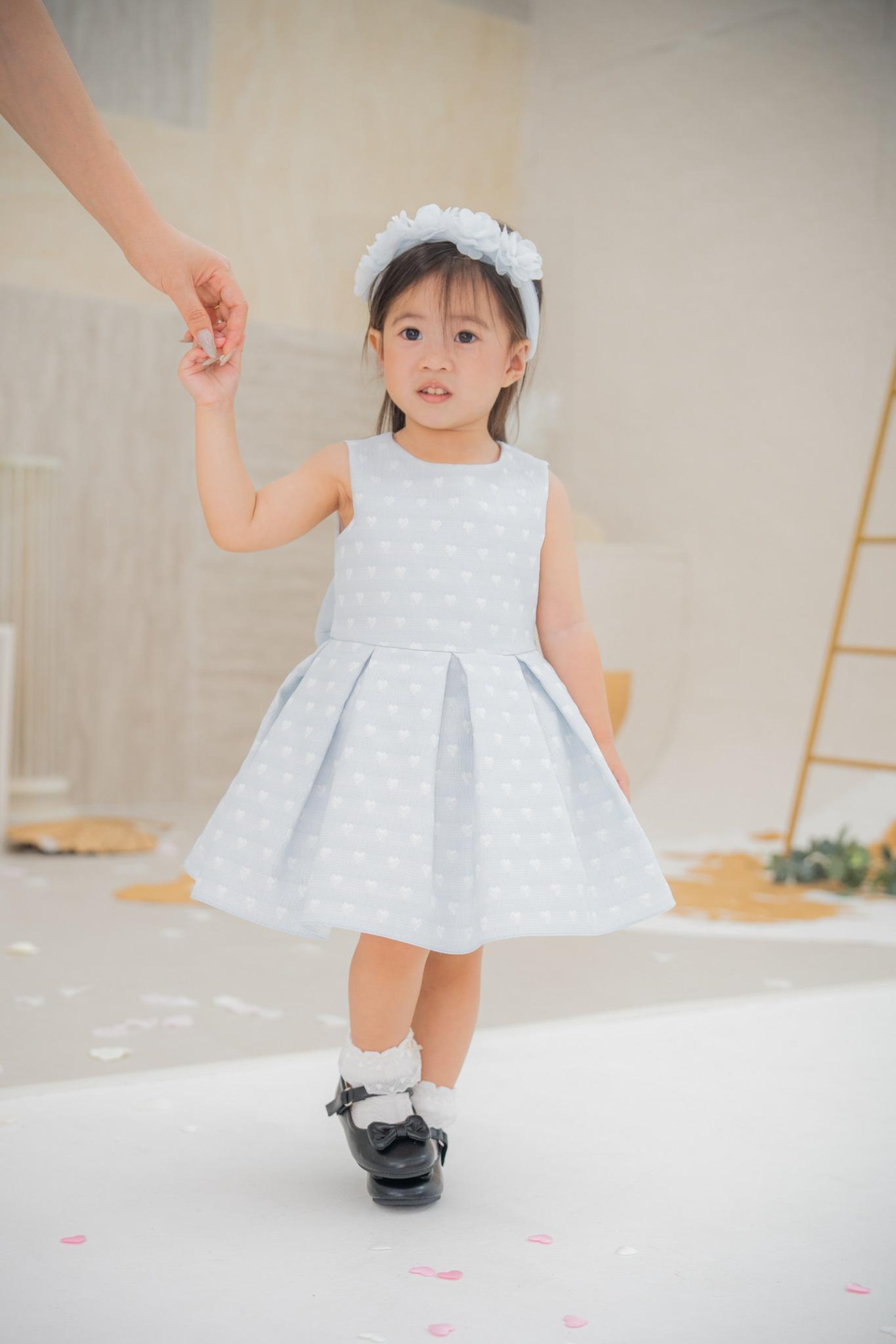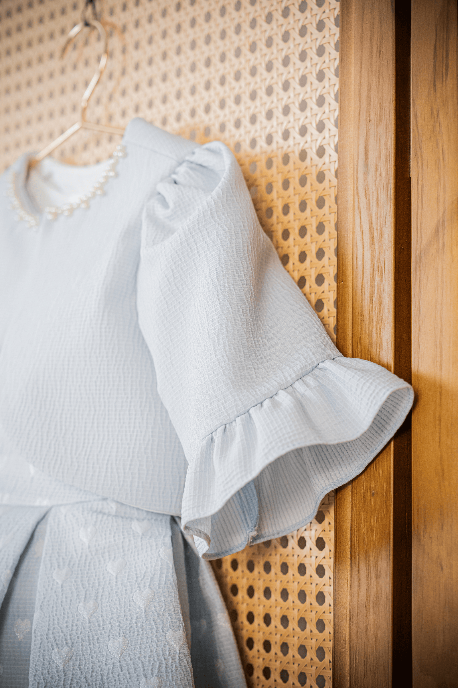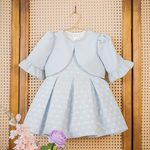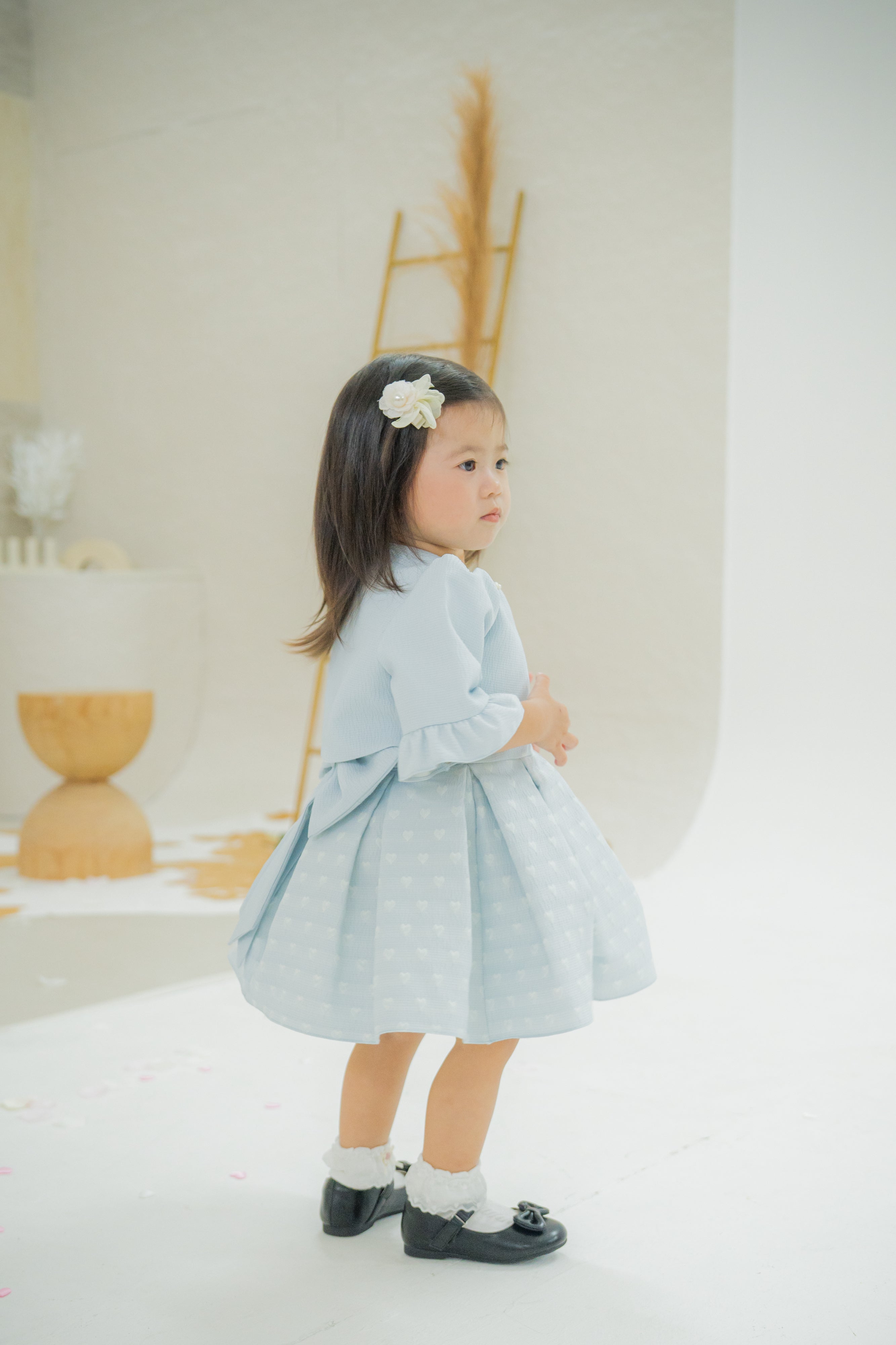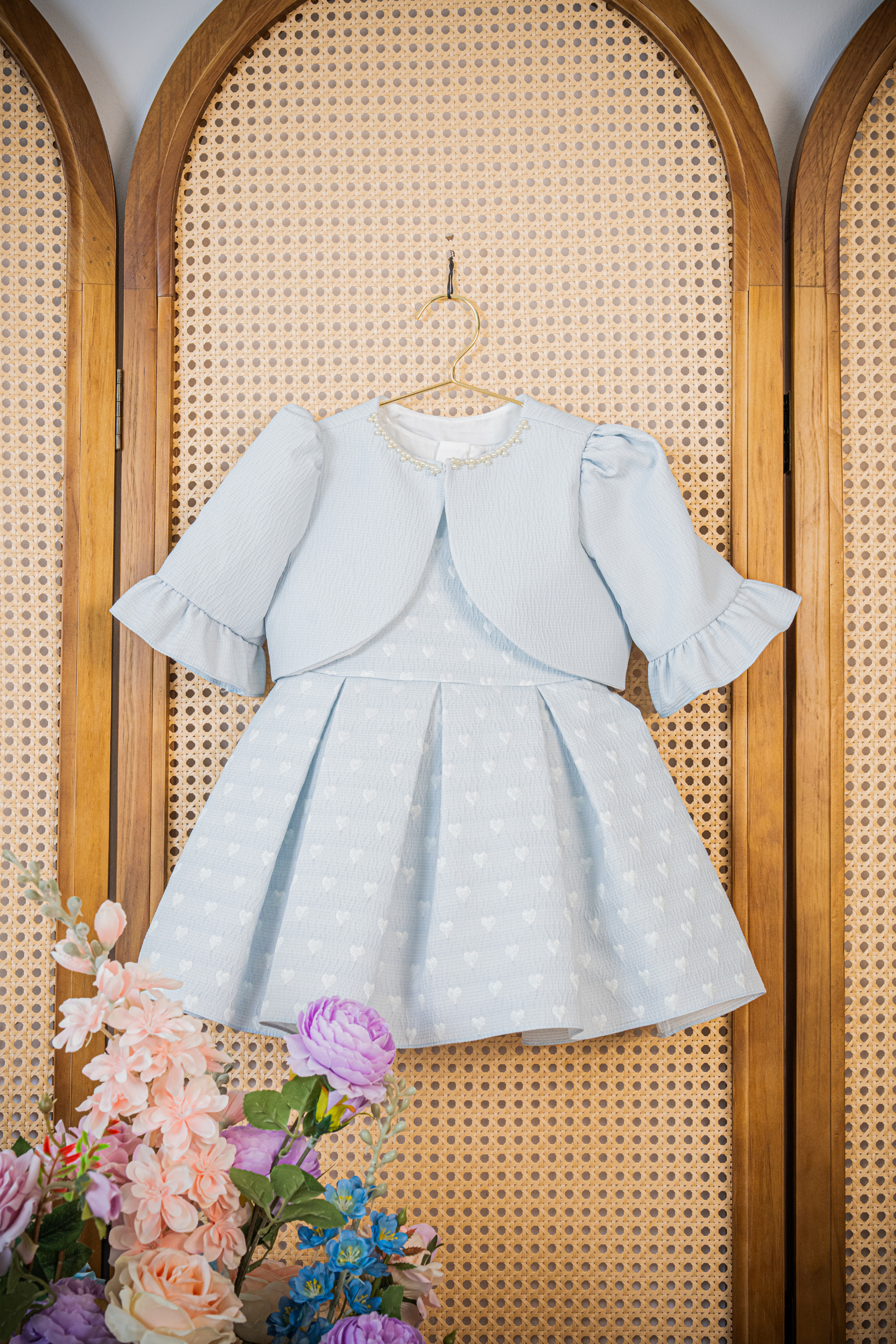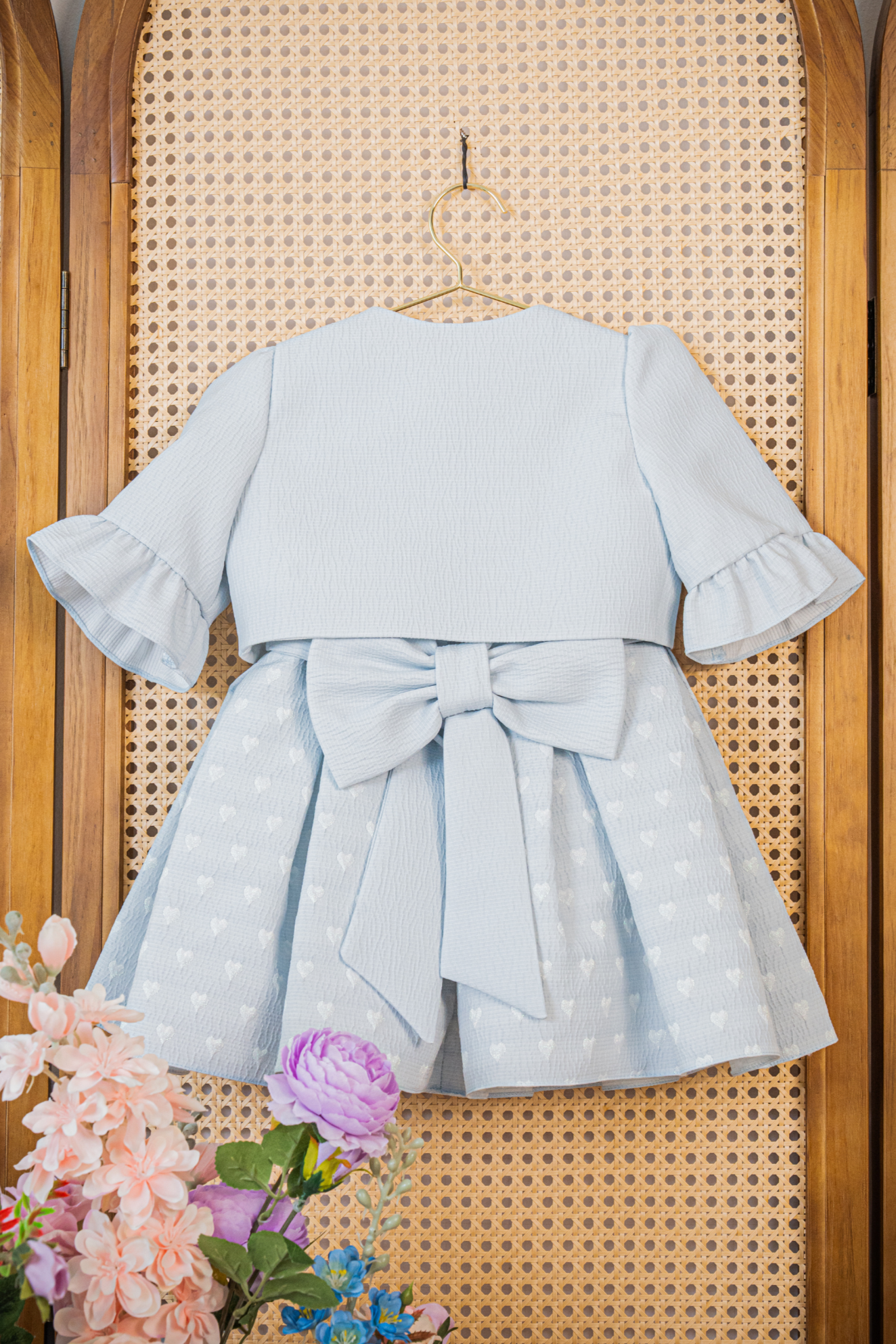 The Selin Grace Dress is the perfect blend of style and comfort. Featuring a removable bolero jacket, flutter sleeves, and an adjustable bow at the back, this dress is both classic and practical. Designed in a soft pastel blue with subtle heart details, it’s ideal for birthdays, weddings, and festive gatherings.